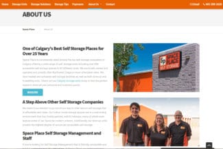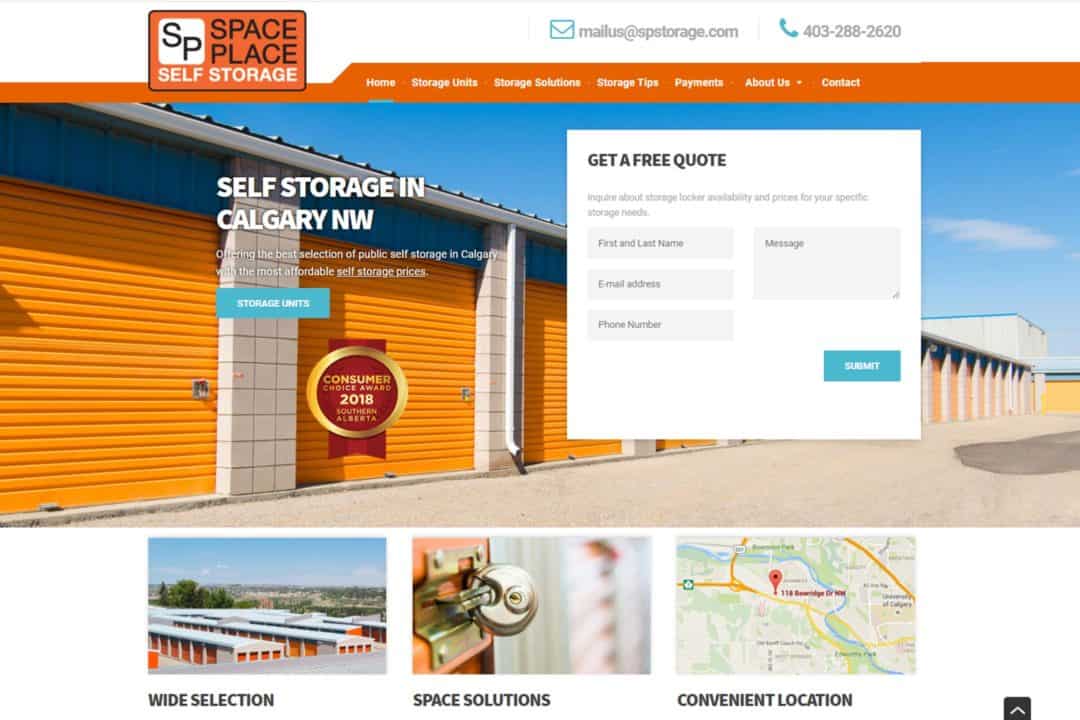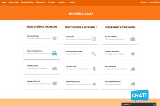 A long-time self storage facility in Calgary, Space Place boasts over 25 years of operation. For this website we wanted to have the orange branding prominent as well as easy contacting options which includes a live chat feature accessible at any time to customers.